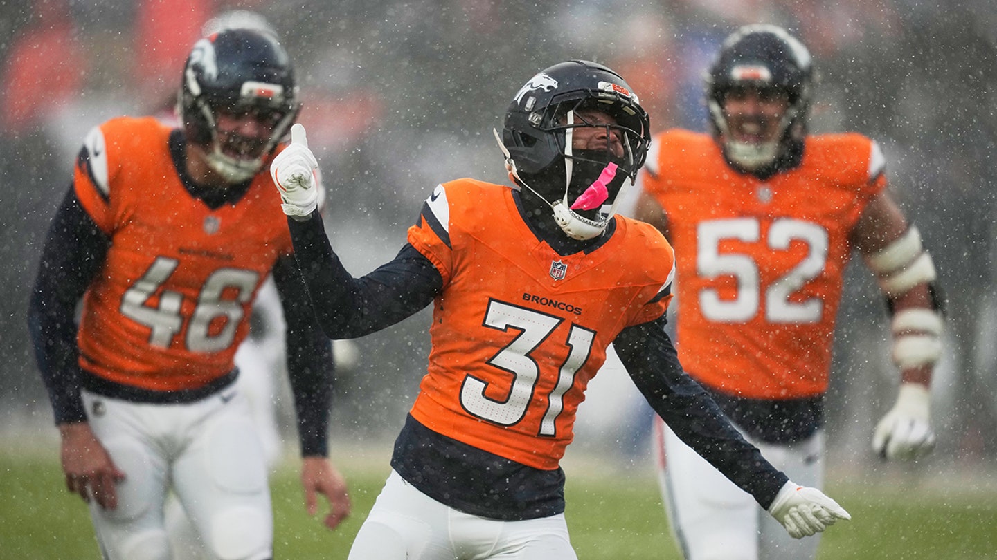 Rohový obranca Denver Broncos Kris Abrams-Draine oslavuje zápas proti New England Patriots počas druhej polovice futbalového zápasu AFC Championship NFL v nedeľu 25. januára 2026 v Denveri. (AP Photo/John Locher)