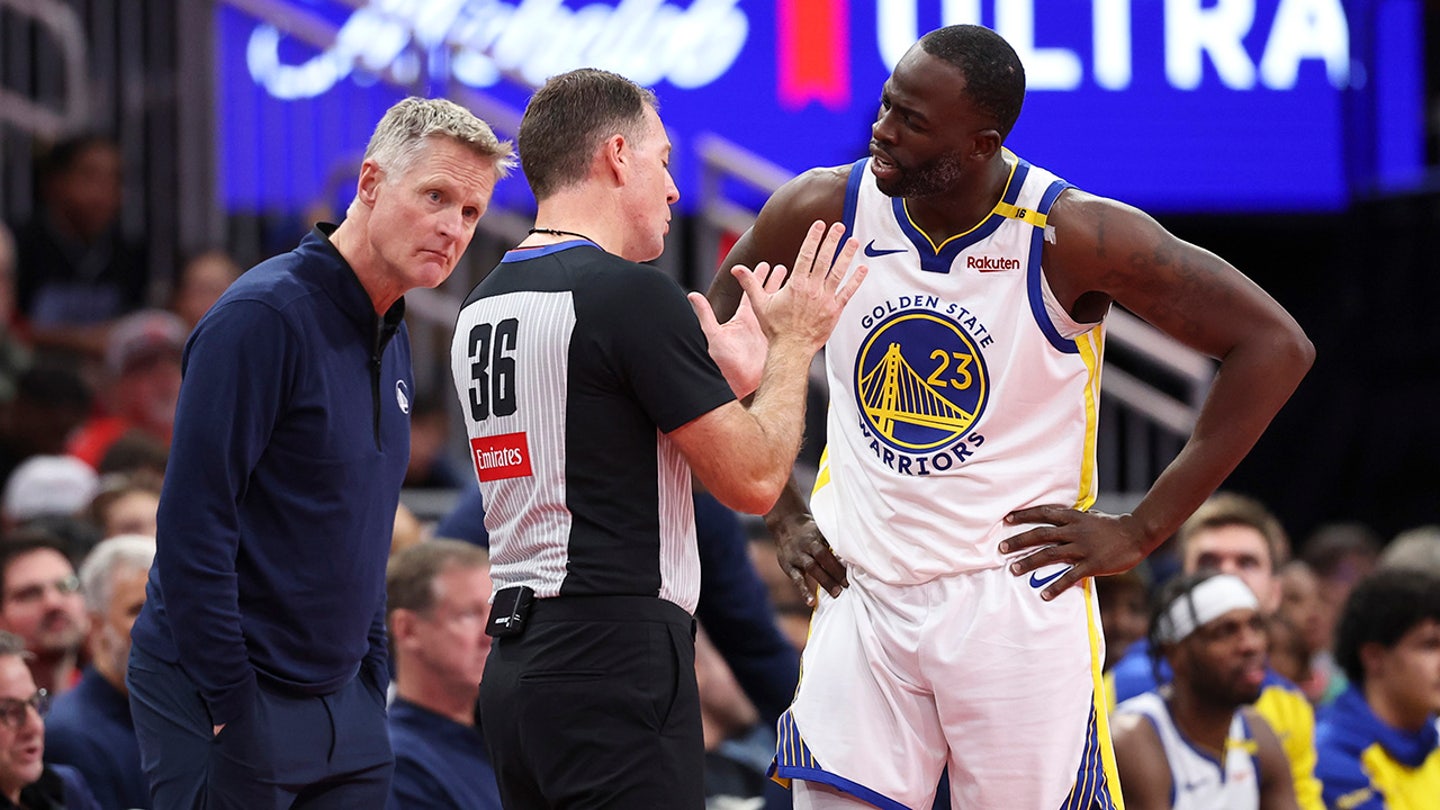 Hlavný tréner Golden State Warriors Steve Kerr sa pozerá na útočníka Draymonda Greena (23) rozhovory s funkcionárom počas prvého polčasu proti Houston Rockets v Toyota Center 11. decembra 2024 v Houstone v Texase. (Troy Taormina/Imagn Images)