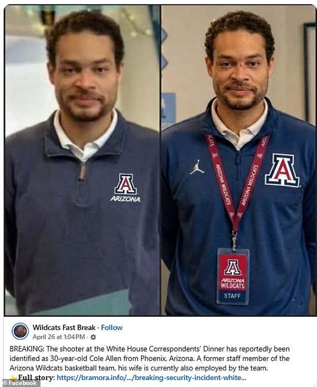 „BREAKING,“ začína jeden príspevok na Facebooku. „Strelec na večeri korešpondentov Bieleho domu bol údajne identifikovaný ako 30-ročný Cole Allen z Phoenixu v Arizone. Bývalý zamestnanec basketbalového tímu Arizony, jeho manželka je v súčasnosti tiež zamestnaná v tíme.“