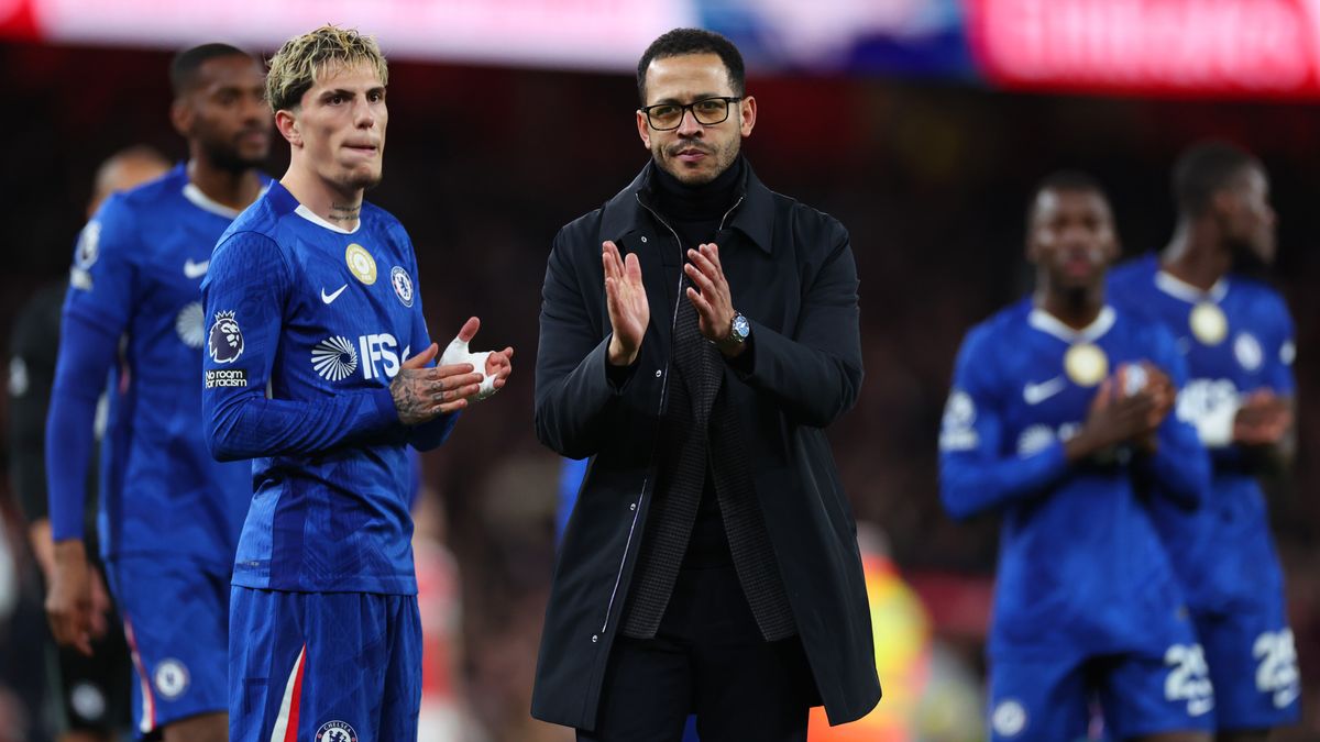 Hlavný tréner Chelsea Liam Rosenior tlieska medzi svojimi hráčmi po zápase Premier League medzi Arsenalom a Chelsea na Emirates Stadium 1. marca 2026 v Londýne v Anglicku