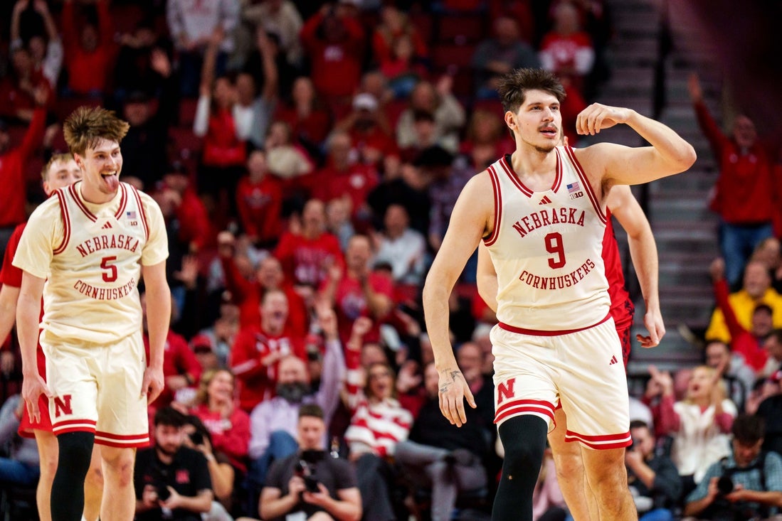 10. decembra 2025; Lincoln, Nebraska, USA; Útočník Nebrasky Cornhuskers Berke Buyuktuncel (9) reaguje po koši proti Wisconsin Badgers počas druhého polčasu v Pinnacle Bank Arena. Povinný kredit: Dylan Widger-Imagn Images