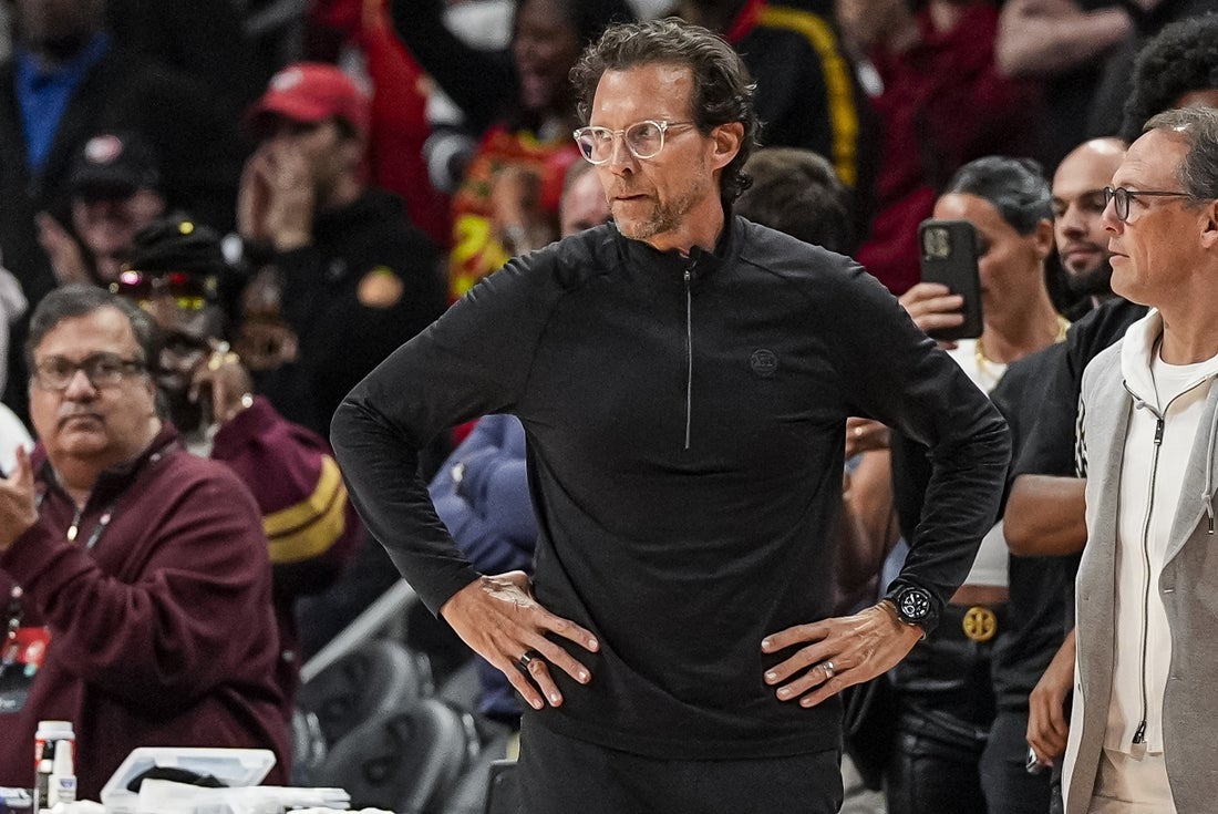 10. apríla 2026; Atlanta, Georgia, USA; Hlavný tréner Atlanty Hawks Quin Snyder reaguje na postrannej čiare počas zápasu proti Clevelandu Cavaliers počas druhého polčasu v State Farm Arena. Povinný kredit: Dale Zanine-Imagn Images