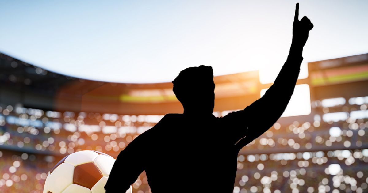 Silueta futbalového hráča oslavujúceho popri pozadí futbalového ihriska
