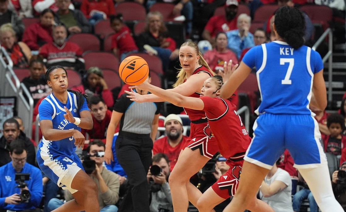 Strážca Kentucky Tonie Morgan (5) prihráva loptu útočníkovi Teonnimu Keyovi (7) proti Louisville v KFC Yum! centrum. 22. novembra 2025