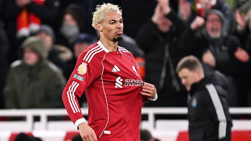 Hugo Ekitike oslavuje gól za Liverpool proti Newcastlu United na Anfielde