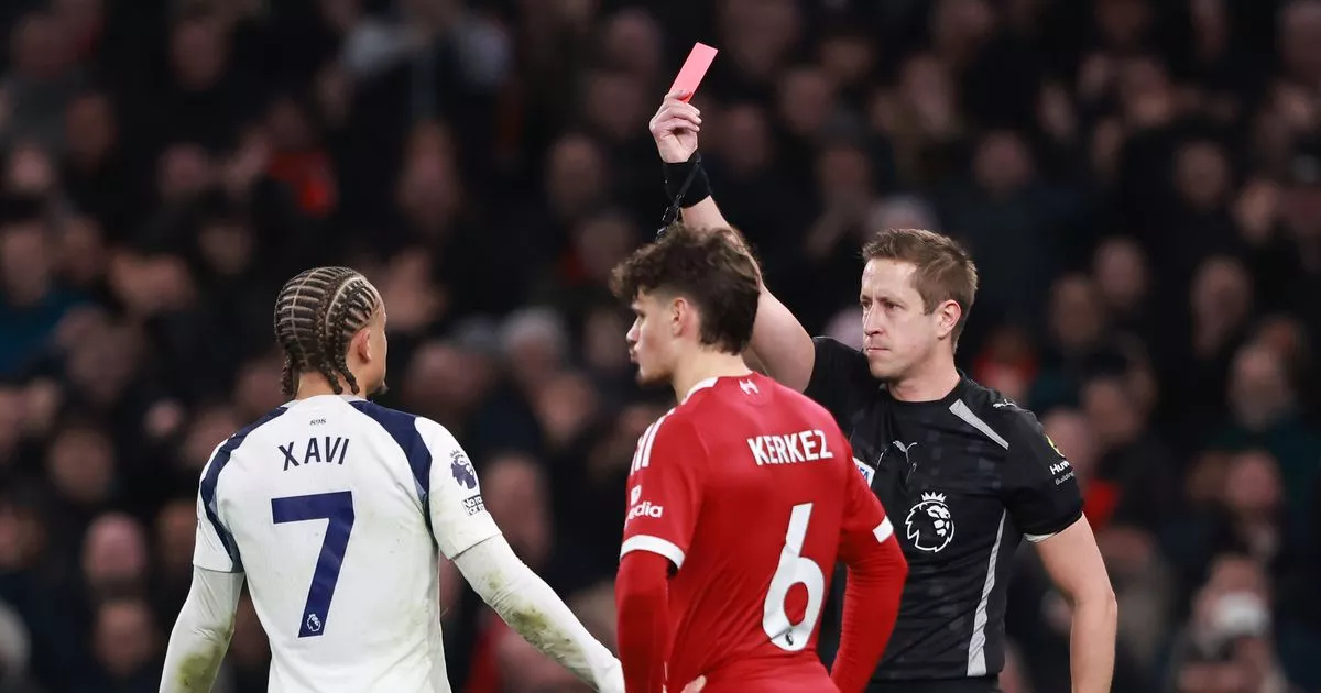 Xavi Simons bol vylúčený počas zápasu s Liverpoolom, ktorý Spurs prehrali 2:1, pričom rozkaz na pochod dostal aj Cristian Romero.