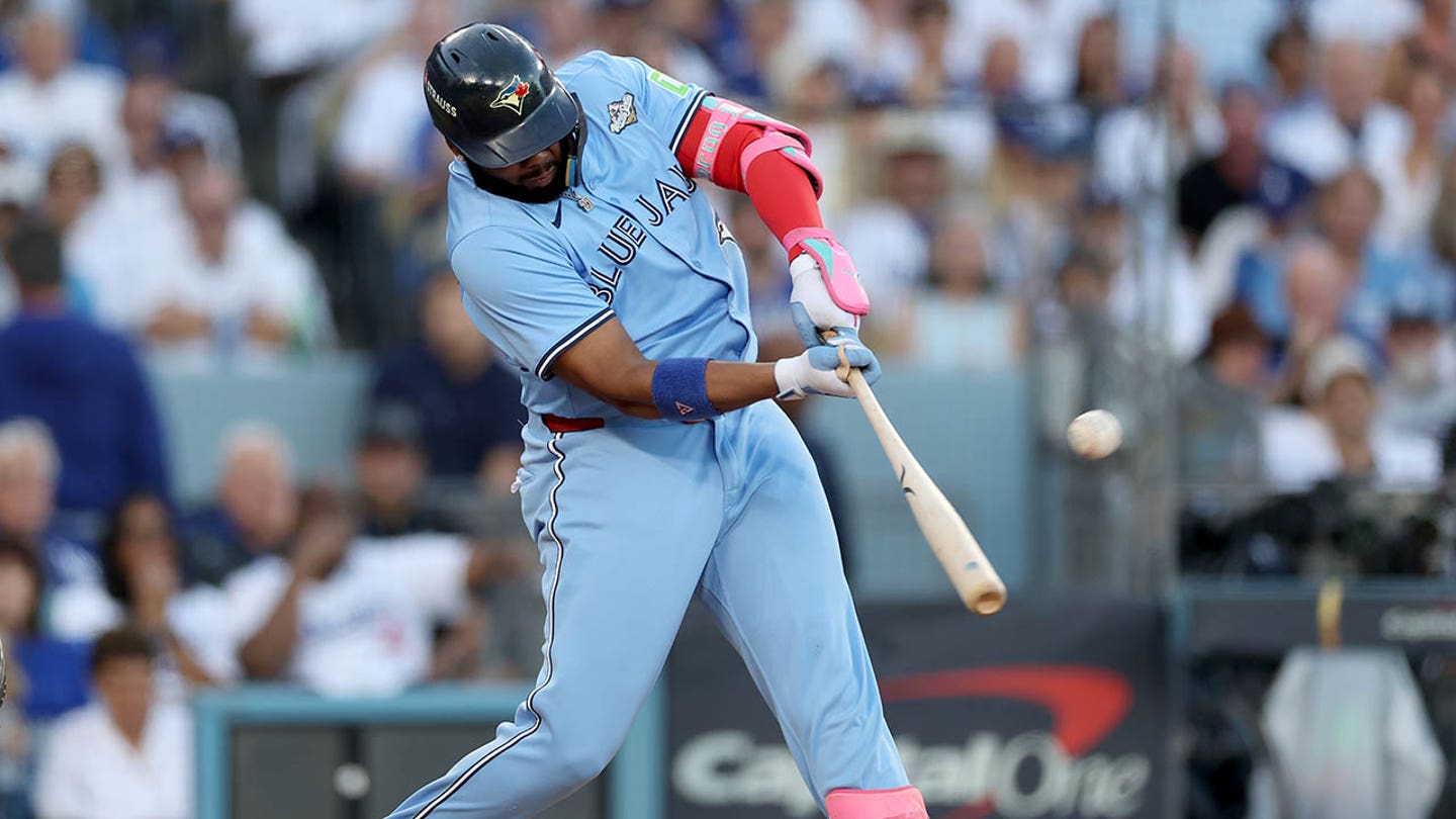 Vladimir Guerrero Jr. z Toronto Blue Jays dosiahol v porovnaní s Los Angeles Dodgers vrcholný úspech počas úvodnej zmeny vo videohre 5 z 2025 Globe Collection v Dodger Arena 29. októbra 2025 v Los Angeles, The Golden State. ( Luke Hales/Getty Images)