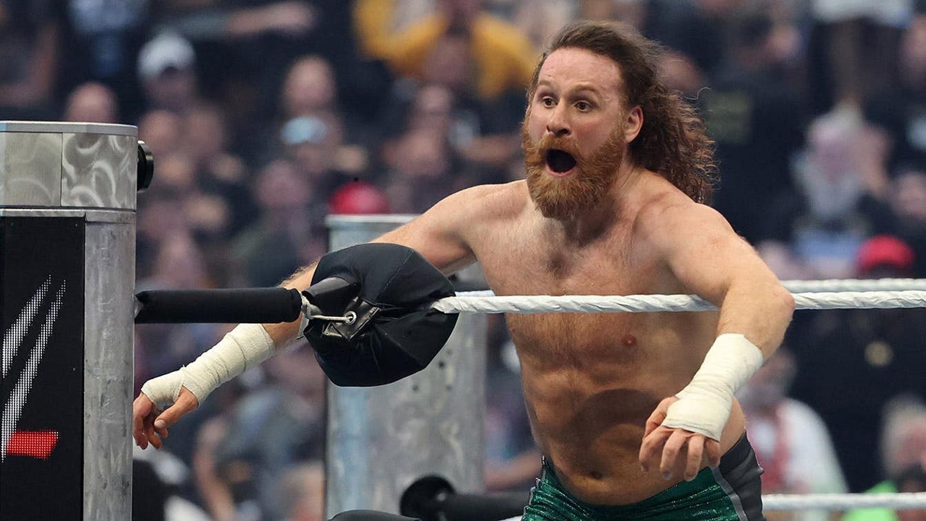 Sami Zayn reaguje počas zápasu majstrovstiev Spojených štátov proti Trickovi Williamsovi na WrestleMania 42 na Allegiant Stadium v Las Vegas, Nev. 19. apríla 2026. (Ethan Miller/Getty Images)