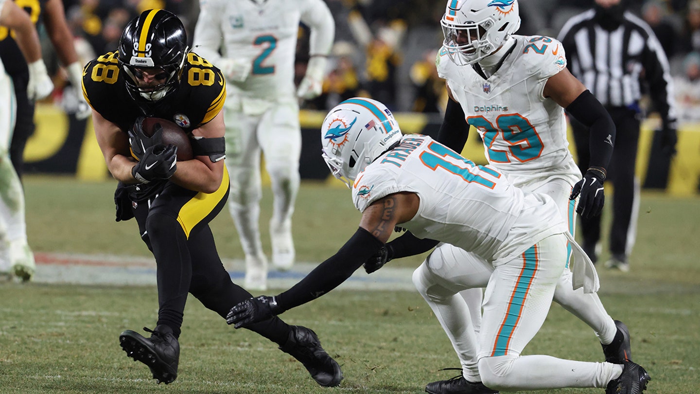Pittsburgh Steelers v tesnom závese Pat Freiermuth (88) beží s loptou v tretej štvrtine proti Miami Dolphins na Acrisure Stadium 15. decembra 2025 v Pittsburghu v Pensylvánii. (Charles LeClaire/Imagn Images)