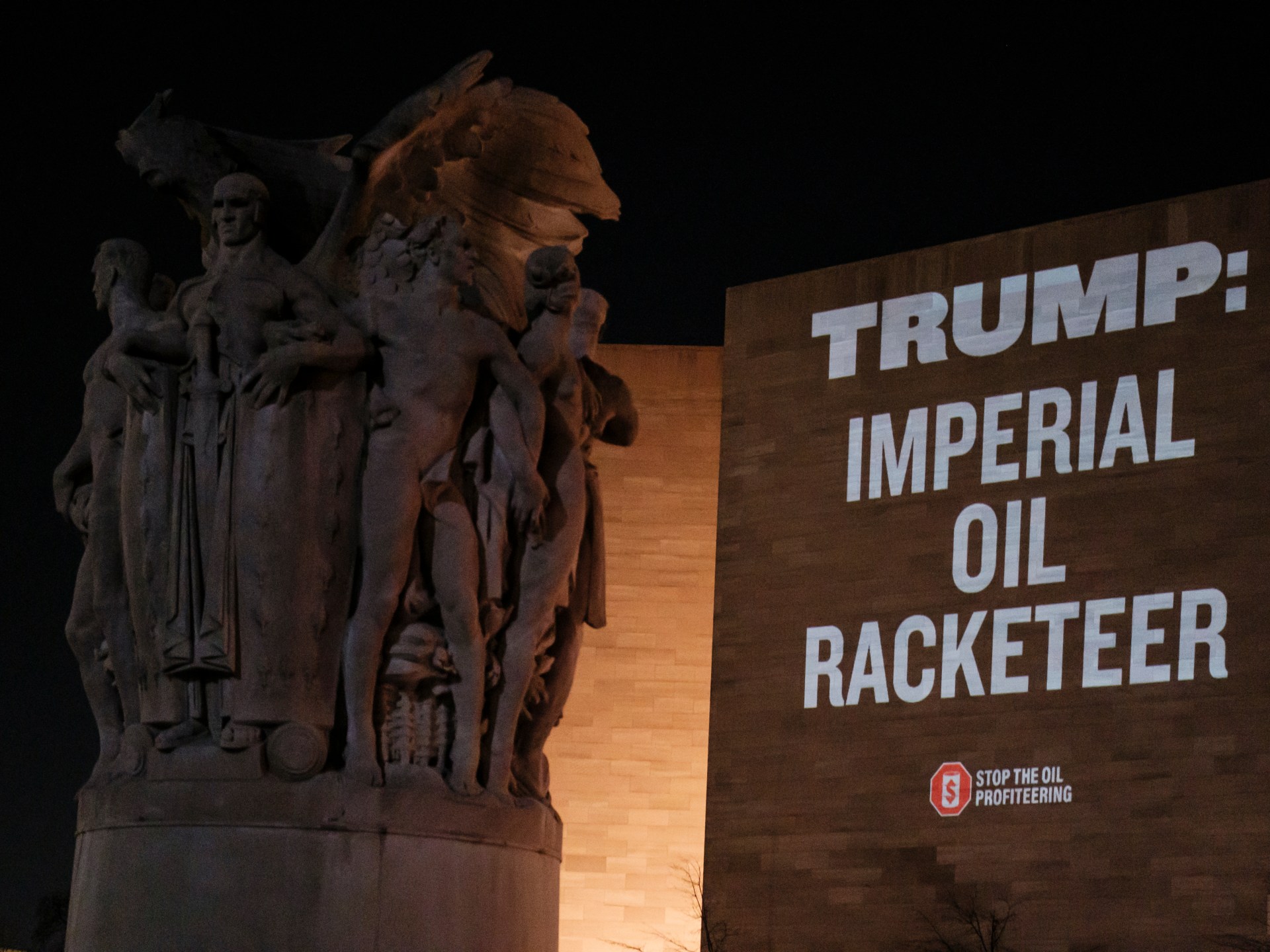Aktivisti organizujú rozsiahlu projekciu proti Trumpovej intervencii vo Venezuele a použitiu dolárov daňových poplatníkov na dotovanie Big Oil 8. januára 2026 vo Washingtone, DC (Handout/Fossil Free Media cez AP)