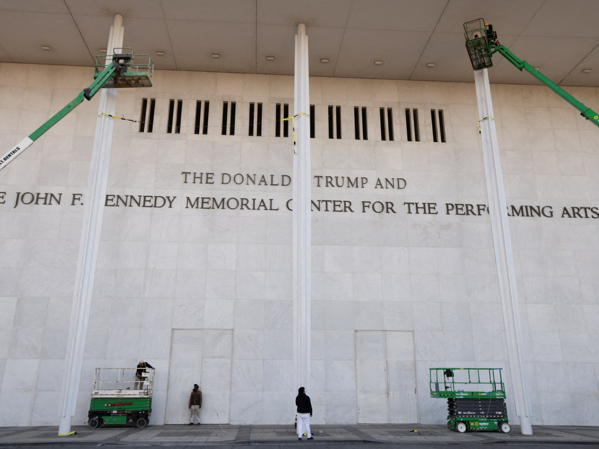 Robotníci pridali v piatok na exteriér budovy kovové nápisy, ktoré hlásali: „Donald J Trump a John F Kennedy Memorial Center for the Performing Arts“.