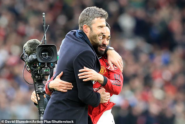 Michael Carrick sa v záverečnom hvizde objíma s Matheusom Cunhom, ktorý hral ako náhradník.