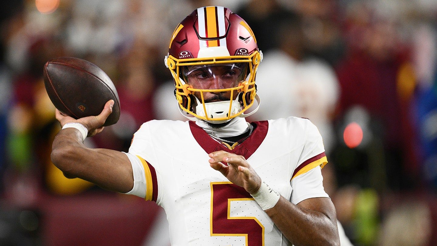 Rozohrávač Washington Commanders Jayden Daniels (5) sa rozcvičuje pred začiatkom futbalového zápasu NFL proti Seattle Seahawks v nedeľu 2. novembra 2025 v Landover, Maryland. (AP Photo/Nick Wass)