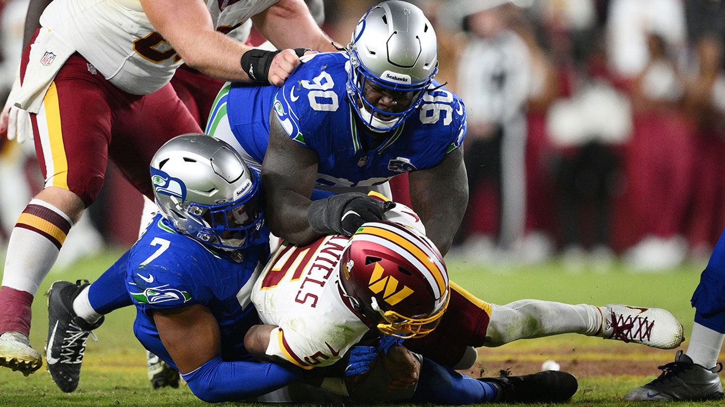 Rozohrávač Washington Commanders Jayden Daniels (5) je odvolaný obrancom Seattle Seahawks Uchennom Nwosuom (7) a defenzívnym hráčom Jarranom Reedom (90) počas druhého polčasu futbalového zápasu NFL, v nedeľu 2. novembra 2025 v Landoveri v štáte Maryland. (AP Photo/Nick Wass)