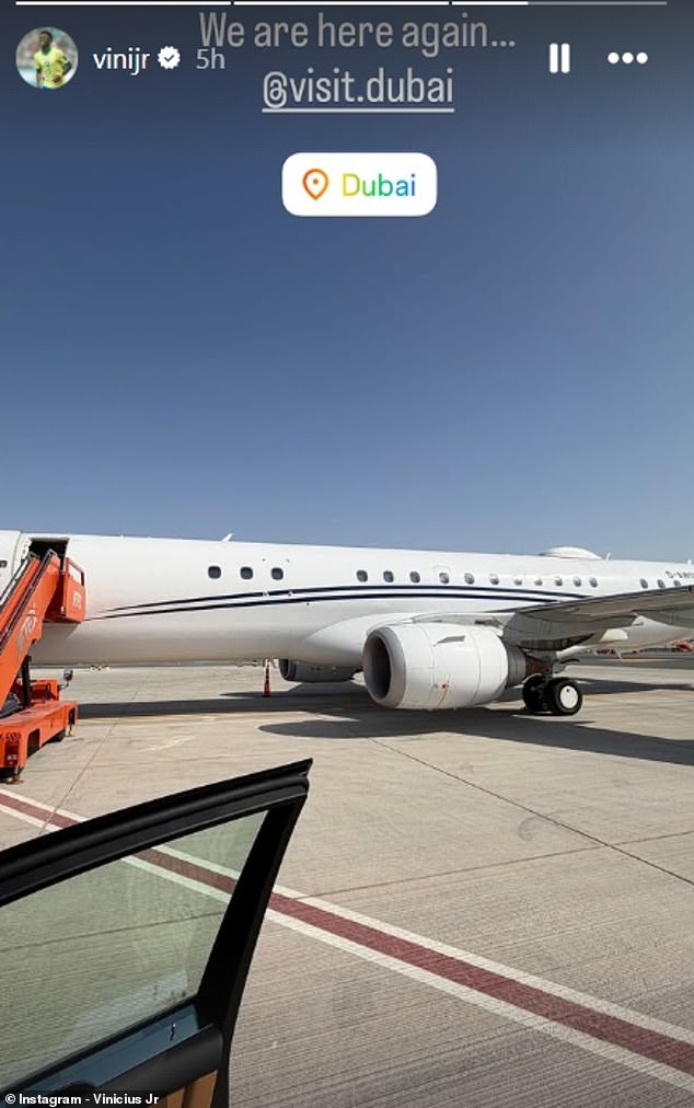 Vinicius zverejnil záber toho, čo vyzeralo ako súkromné ​​lietadlo v dubajskom slnku, a dodal: ‚Sme tu znova… @visit.dubai.‘