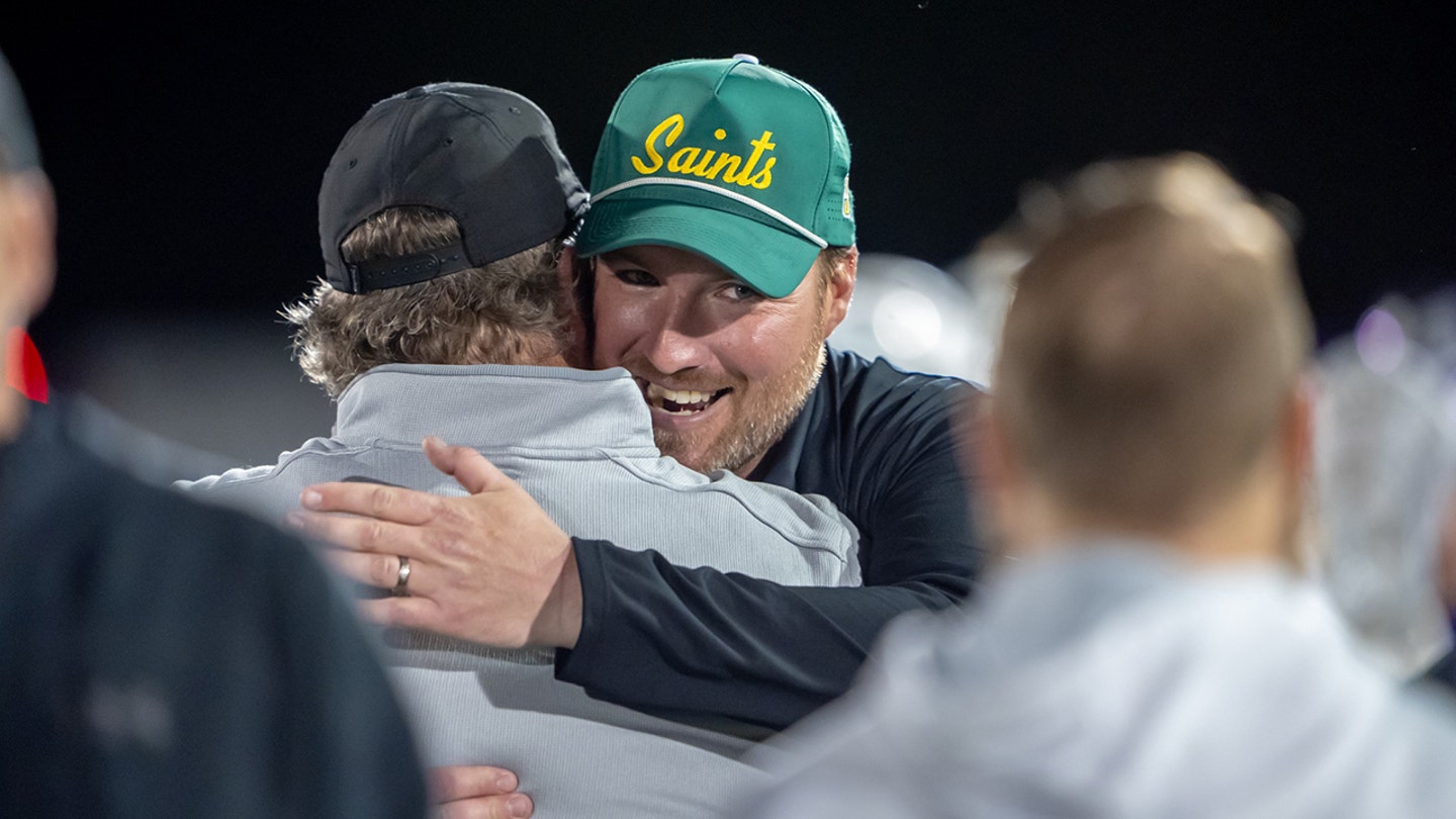 Tréner mužského lakrosu Siena Liam Gleason objíma zamestnanca. (Carlisle Stockton/Stockton Photo)