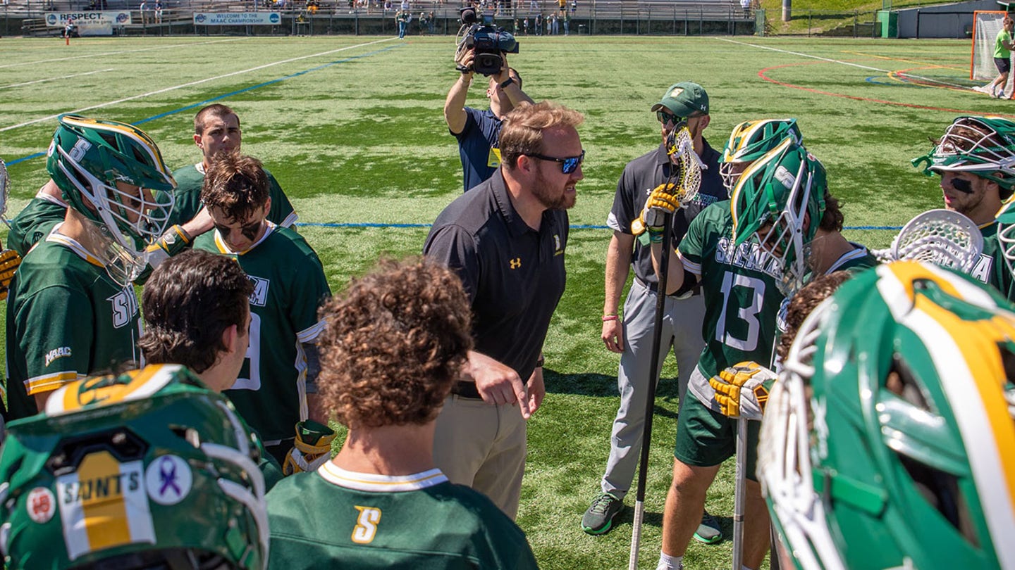 Tréner mužského lakrosu Siena Liam Gleason trénuje svoj tím. (Carlisle Stockton/Stockton Photo)