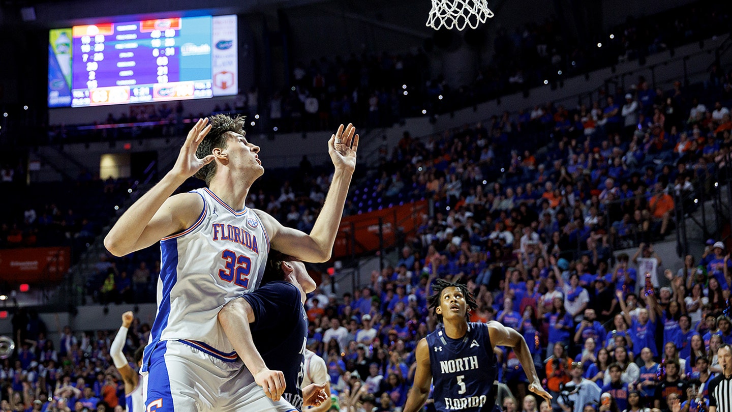 Strážca severnej Floridy Trey Cady, vpredu vpravo, bráni floridskému centru Olivierovi Riouxovi (32) počas druhého polčasu univerzitného basketbalového zápasu NCAA v Gainesville na Floride 6. novembra 2025. (Chris Watkins/Foto AP)
