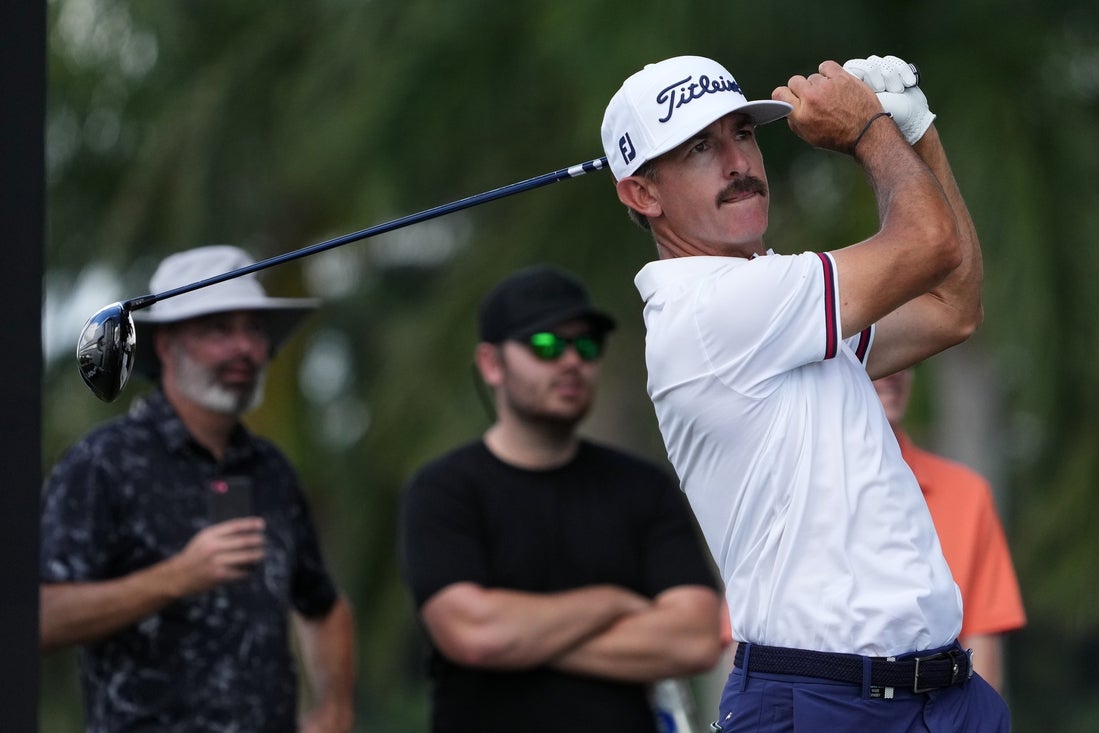 29. októbra 2022; Miami, Florida, USA; Wade Ormsby odpaluje na 17. jamke počas druhého kola finále sezóny série LIV Golf v Trump National Doral. Povinný kredit: Jasen Vinlove-Imagn Images
