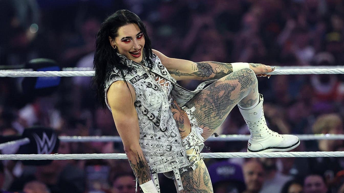 Rhea Ripley je predstavená pred zápasom WWE Women’s Championship proti Jade Cargill počas WrestleMania 42 na Allegiant Stadium v Las Vegas, Nev. 19. apríla 2026. (Ethan Miller/Getty Images)