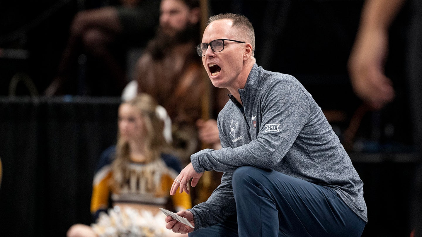 Hlavný tréner West Virginia Mountaineers Mark Kellogg sa v prvom štvrťroku proti Kansas State Wildcats v T-Mobile Center pozerá z postrannej čiary. (Amy Kontras/Imagn Images)