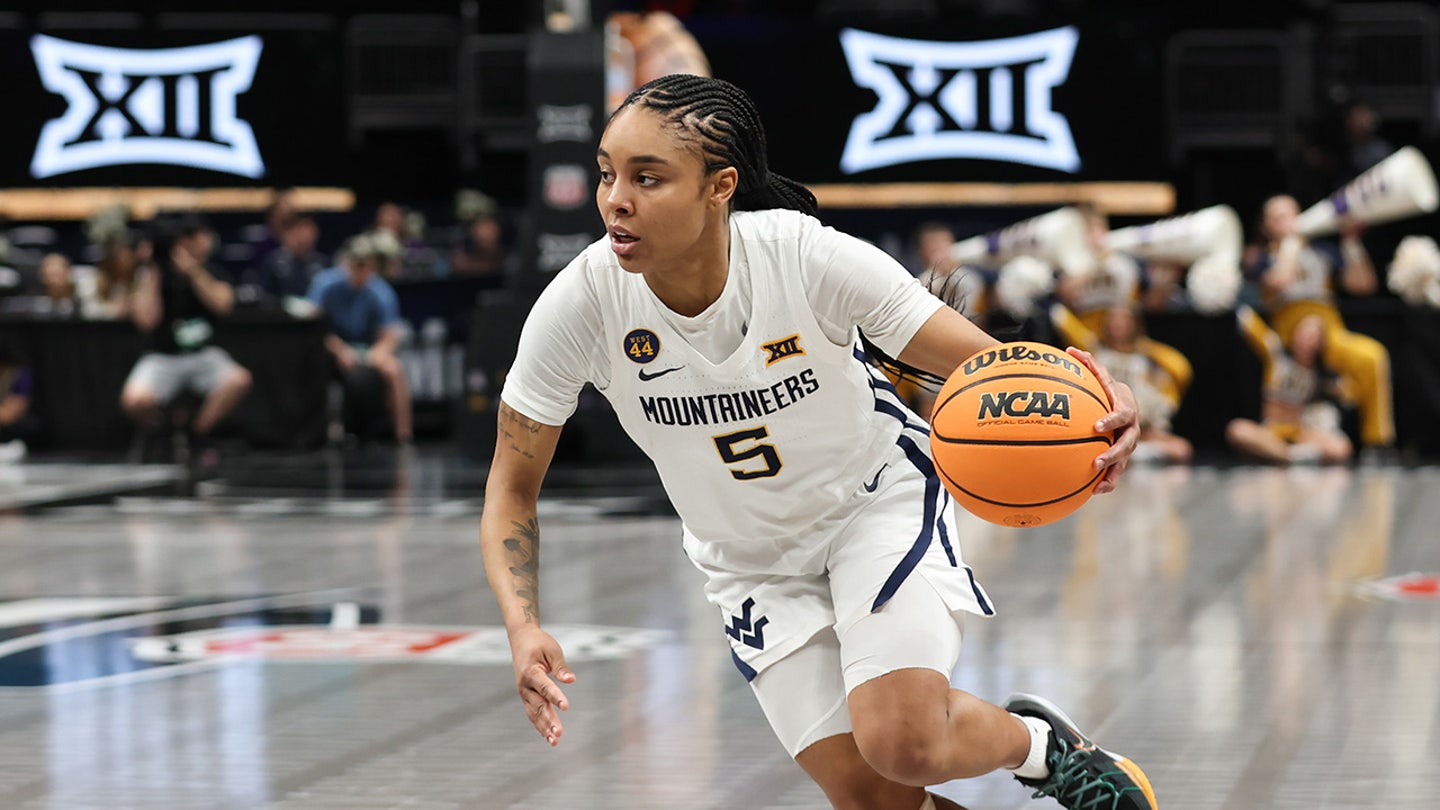 Strážca West Virginia Mountaineers Sydney Shaw jazdí s loptou v druhej štvrtine štvrťfinále ženského turnaja Big 12 medzi Kansas State Wildcats a West Virginia Mountaineers 7. marca 2025 v T-Mobile Center v Kansas City, Missouri. (Scott Winters/Icon Sportswire cez Getty Images)