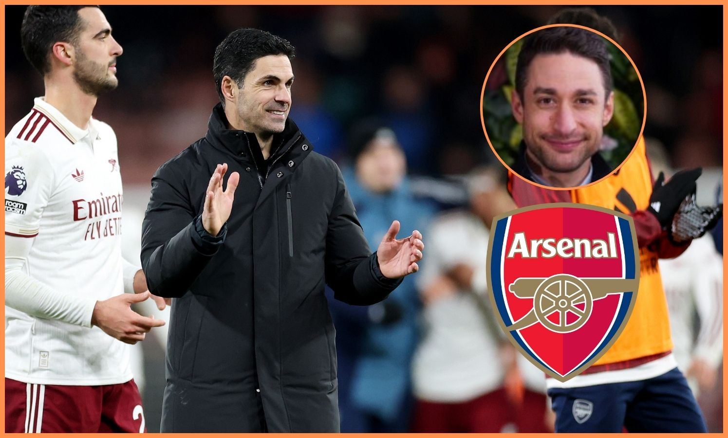 Mikel Arteta, logo Arsenalu a David Ornstein (Foto: Michael Steele/Getty Images)