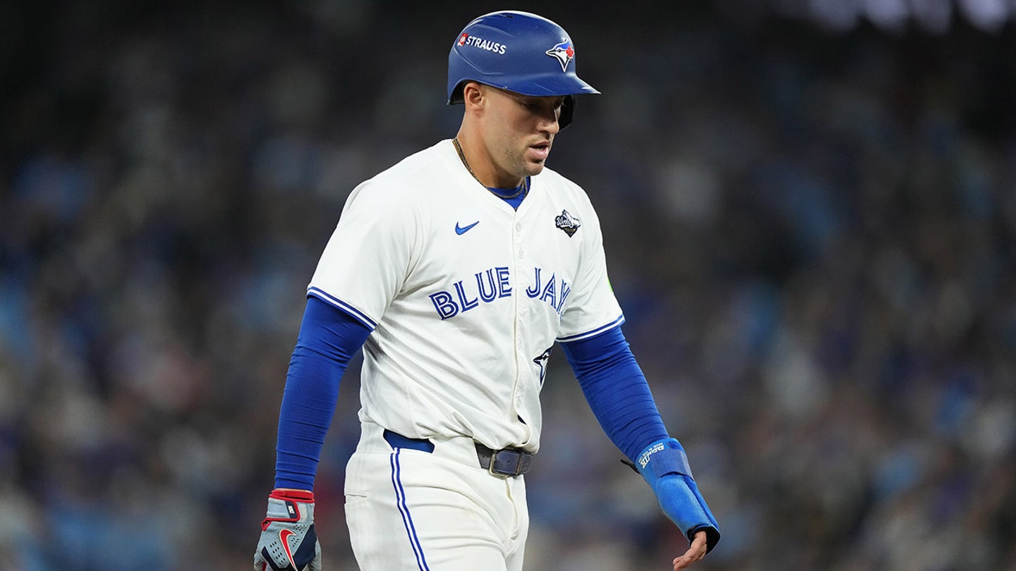 Útočník George Springer (4) určený pre Toronto Blue Jays sa po vyhodení na druhej základni vracia späť do zemljanky, aby v sobotu 1. novembra 2025 ukončil prvú smenu proti Los Angeles Dodgers v zápase 7 bejzbalovej Svetovej série v Toronte. (Nathan Denette/The Canadian Press prostredníctvom AP)