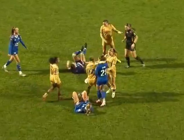 Nie je jasné, či pri páde zakopla o spoluhráča, ale rozhodkyňa Alice Parkerová okamžite vystavila červenú kartu.