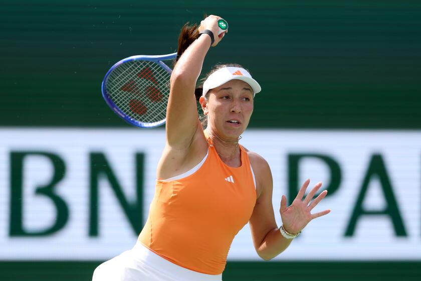 Jessica Pegula vracia strelu Jelene Ostapenkovej počas pondelkového turnaja BNP Paribas Open v Indian Wells. (Matthew Stockman/Getty Images)