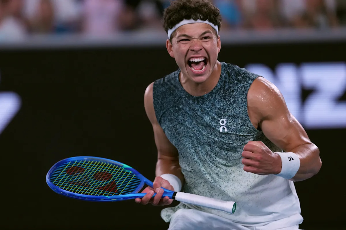 Ben Shelton z USA oslavuje po tom, čo porazil Valentina Vacherota z Monaka v zápase tretieho kola na tenisovom šampionáte Australian Open v austrálskom Melbourne v sobotu 24. januára 2026. (AP Photo/Aaron Favila)